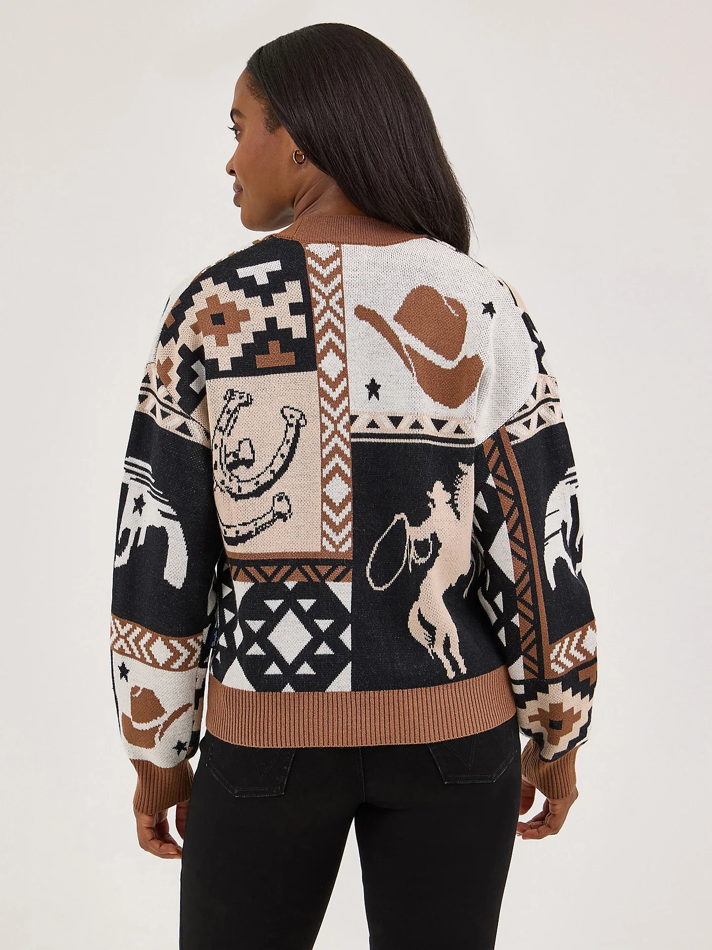 Brown, Black and Cream Retro Western Print Cropped Cardigan Sweater.