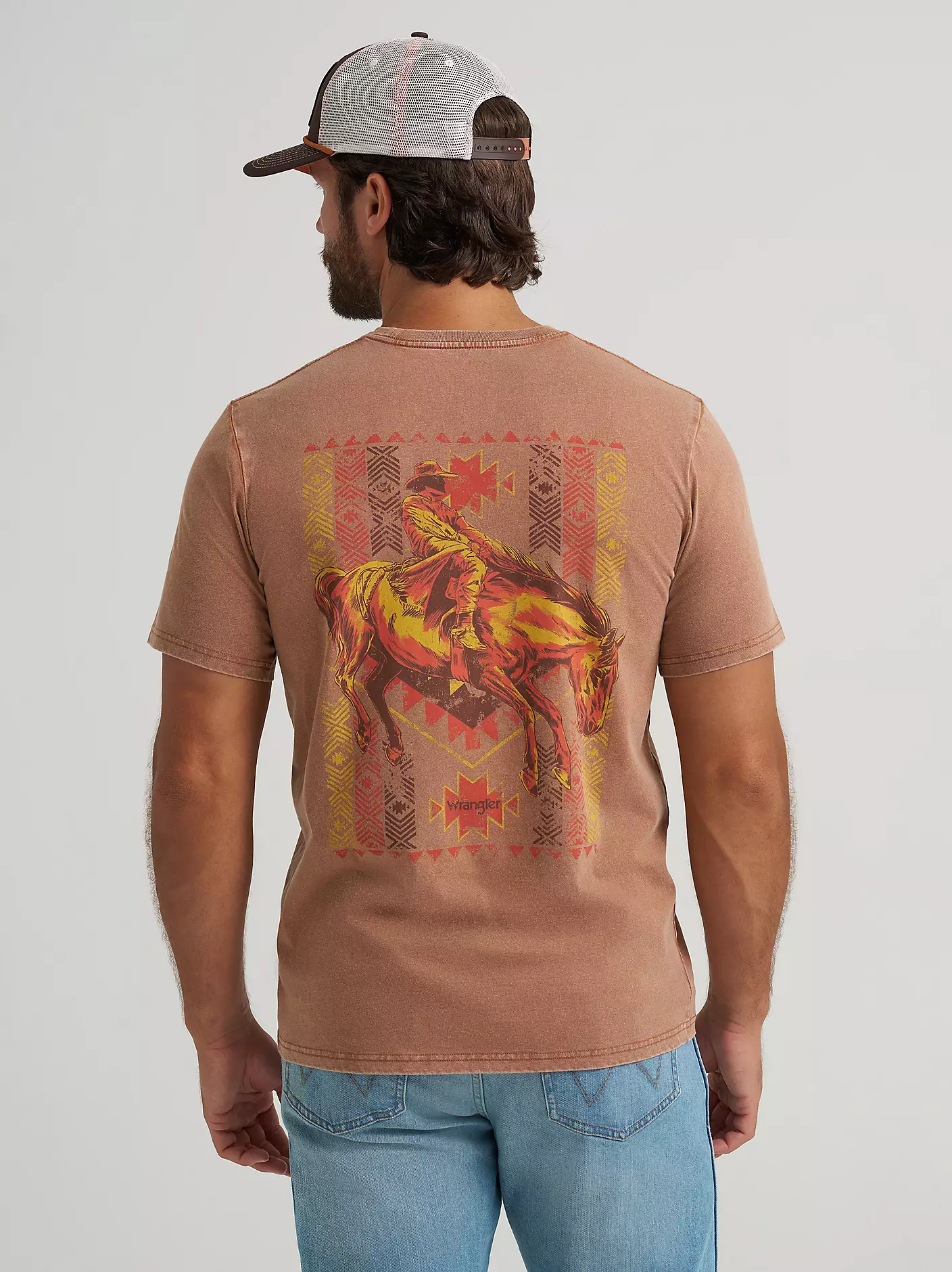 This Southwestern Bronco Back Graphic Acid Wash T-Shirt brings a touch of cowboy spirit to any outfit with a Navajo-inspired print on the left-side chest and a large graphic across the back of a bronc rider in action. The cut: standard and straight with a non-fitted waist. Nothing goes better with your Wrangler® denim than a classic crewneck tee.
