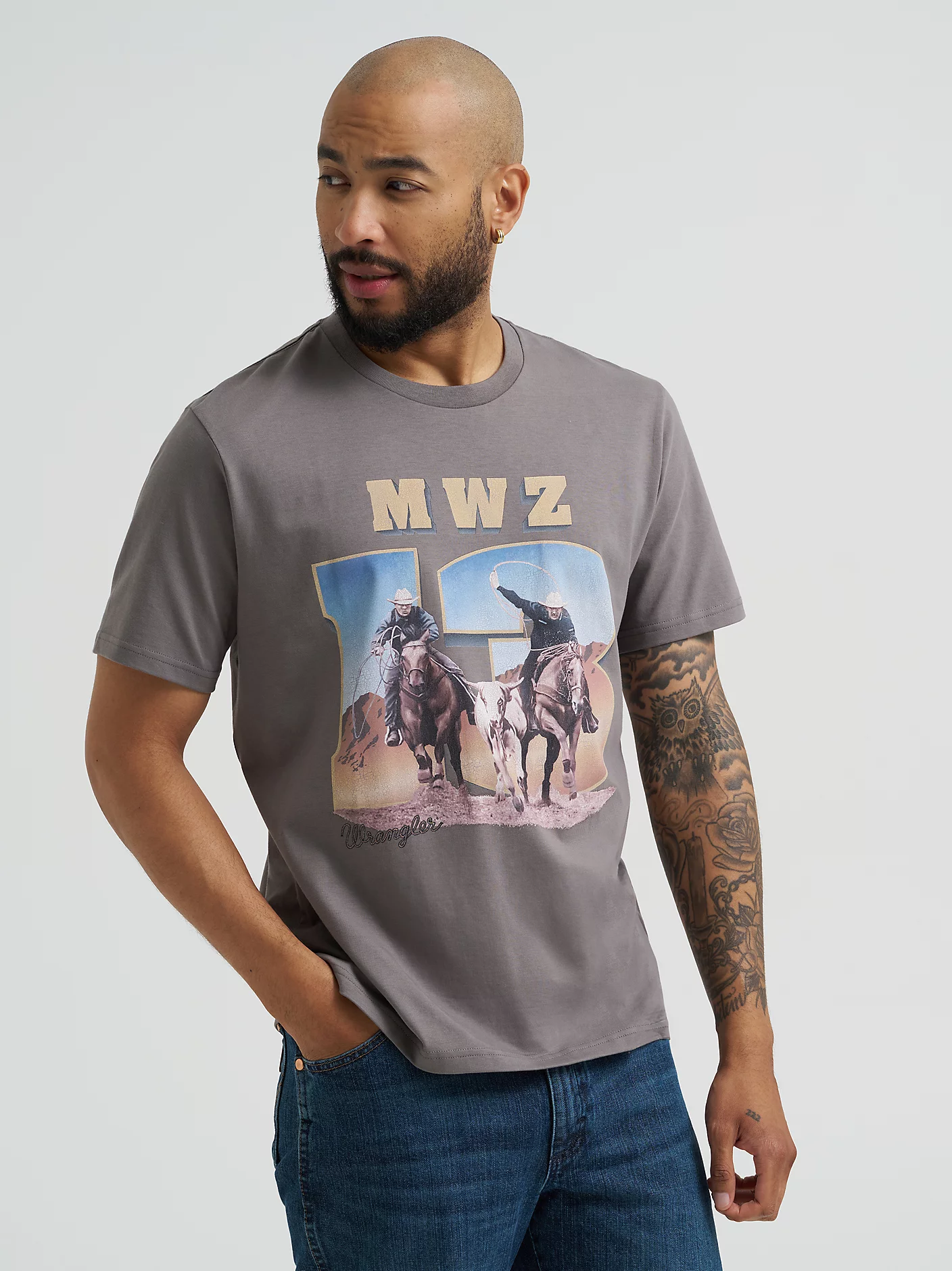 This is where it started, where Wrangler® began. Our Reissue 13MWZ Graphic T-Shirt pays homage to those roots through a retro-inspired graphic print of two cowboys in action, chasing down a stray steer, with the rope logo added in for an extra touch of authenticity. This classic crewneck features a regular fit that always feels just right, and it’s made of 100% cotton to keep you comfortable.