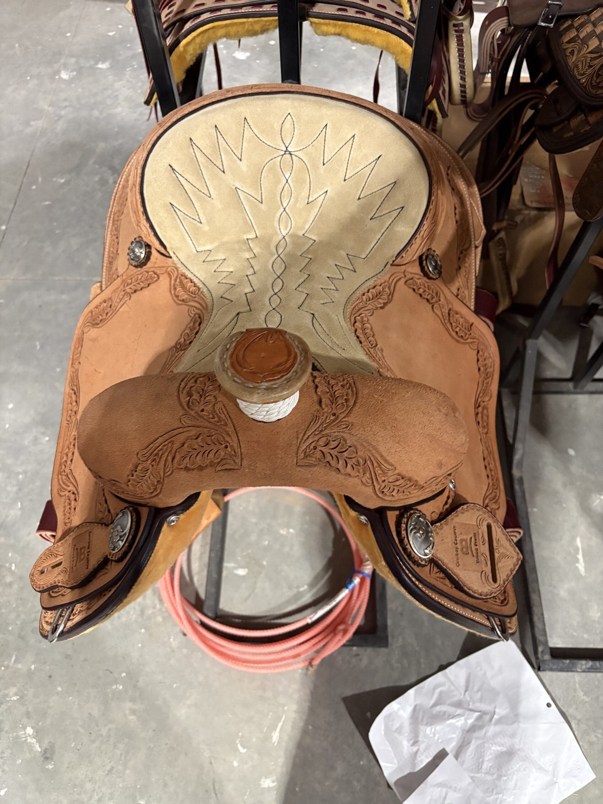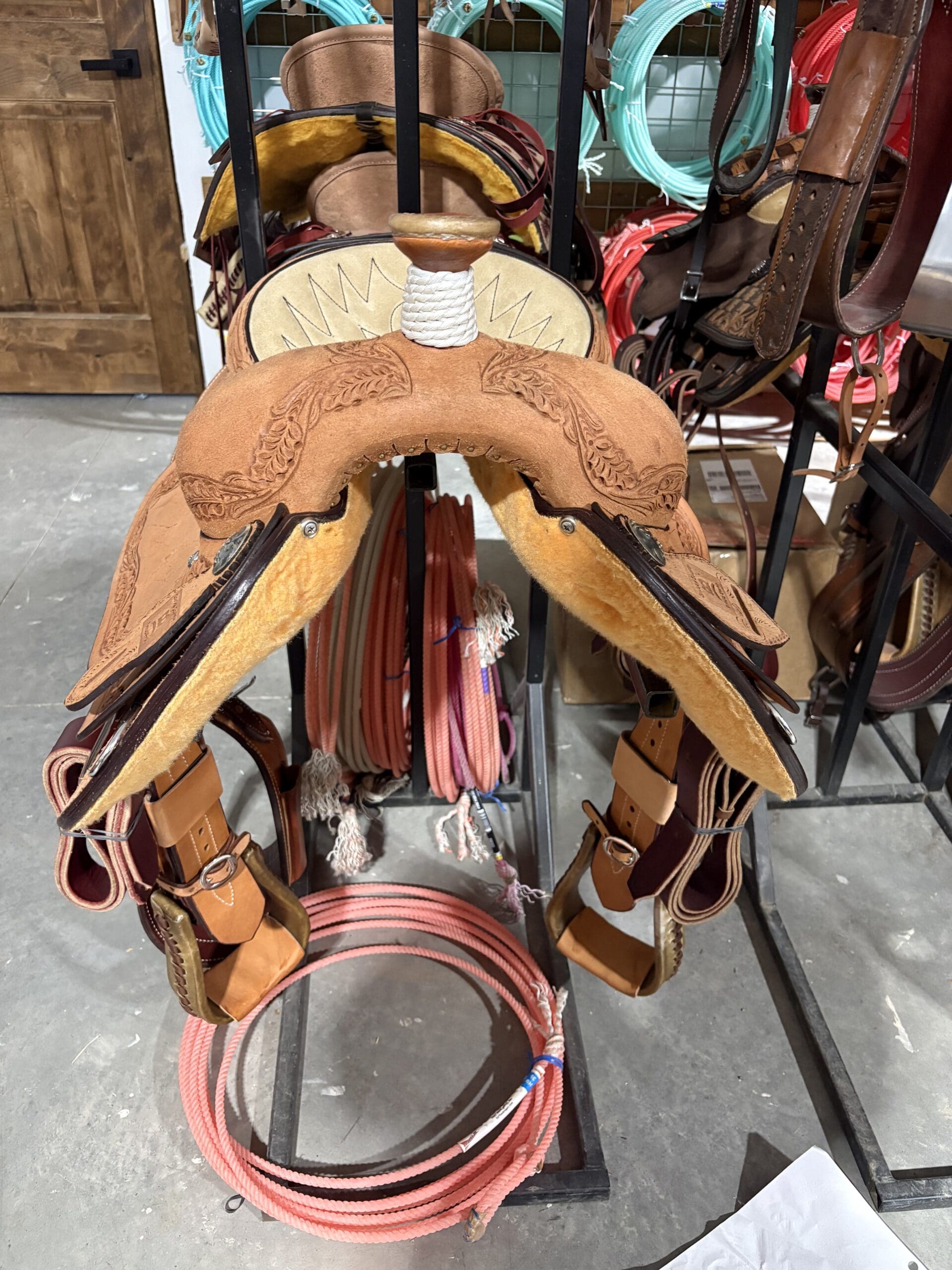 CALF ROPER W/ TEAM ROPER HORN 13.5″ ROUGHOUT, LEATHER CANTLE , DEE CUT SKIRT, 3″ ROPER STIRRUPS MED OIL. FLORAL LEAF BOARDER TOOL QUILTED BLACK ON TAN SUEDE. UPGRADED CN09 CONCHO NYLON BRAIDED HORN – SHORT FENDERS