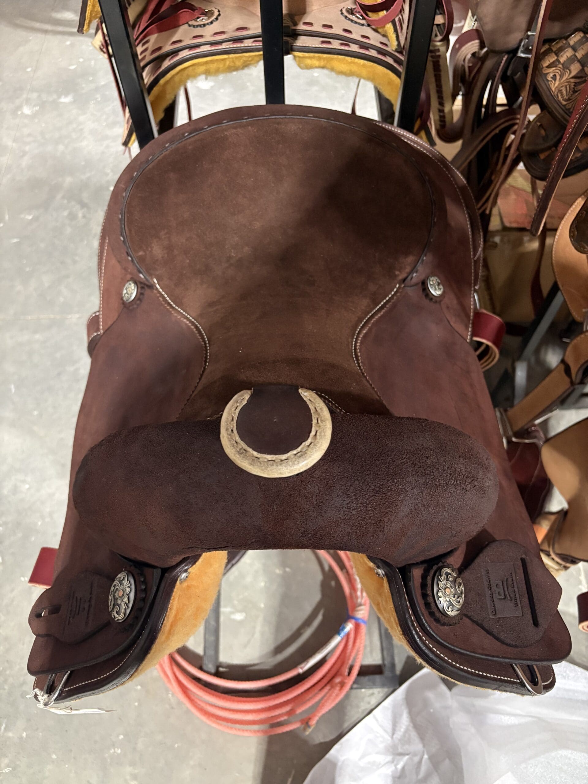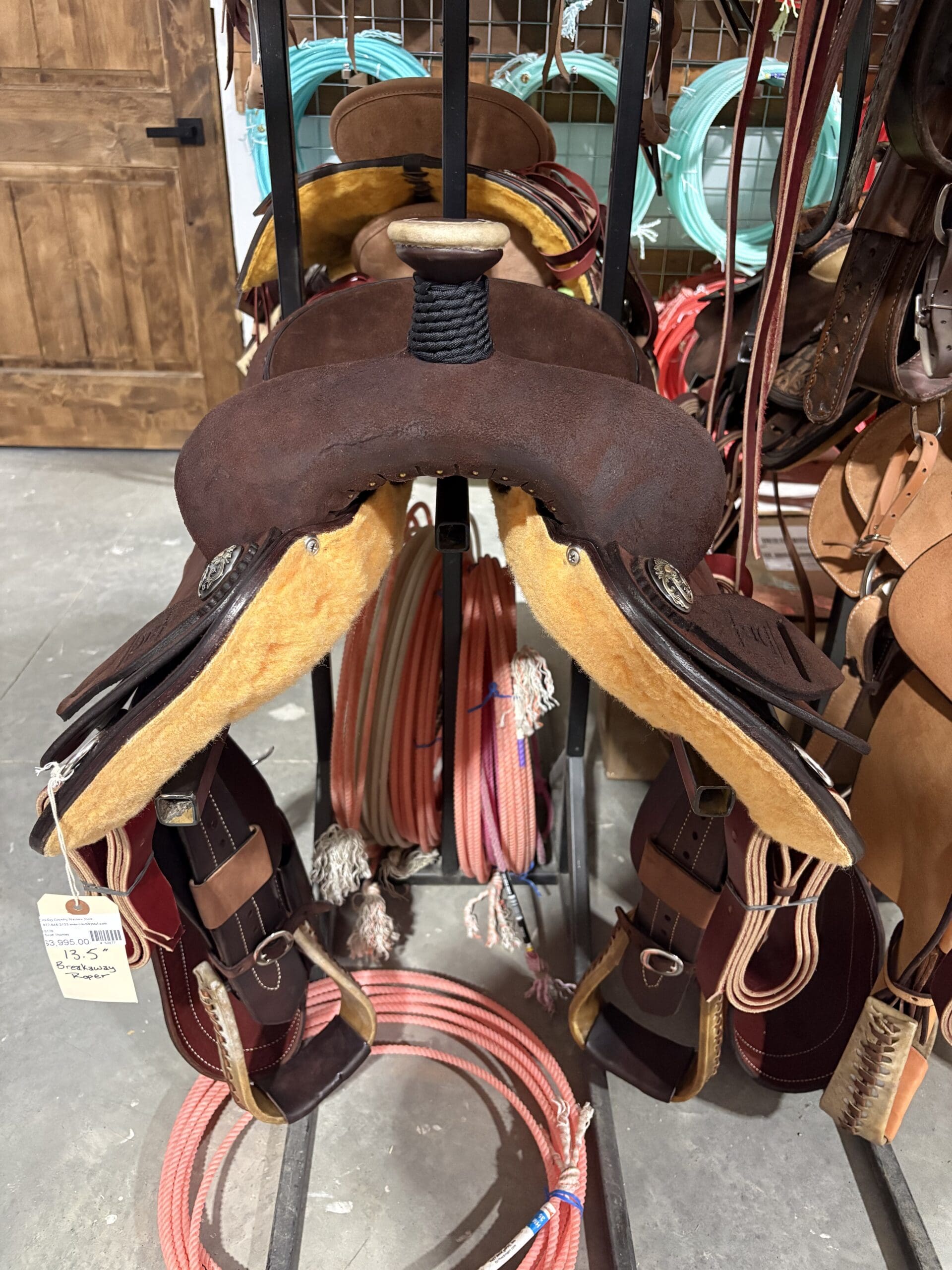 13.5″ BREAKAWAY ROPER. ROUGHOUT WITH LEATHER CANTLE , DEE CUT SKIRTS, 3″ STIRRUPS, MED OIL. NYLON BRAIDED HORN. CHOCOLATE SUEDE SEAT. NOT STITCHING, SADDLE CHOCOLATE LEATHER. UPGRADED CONCHOS CN24