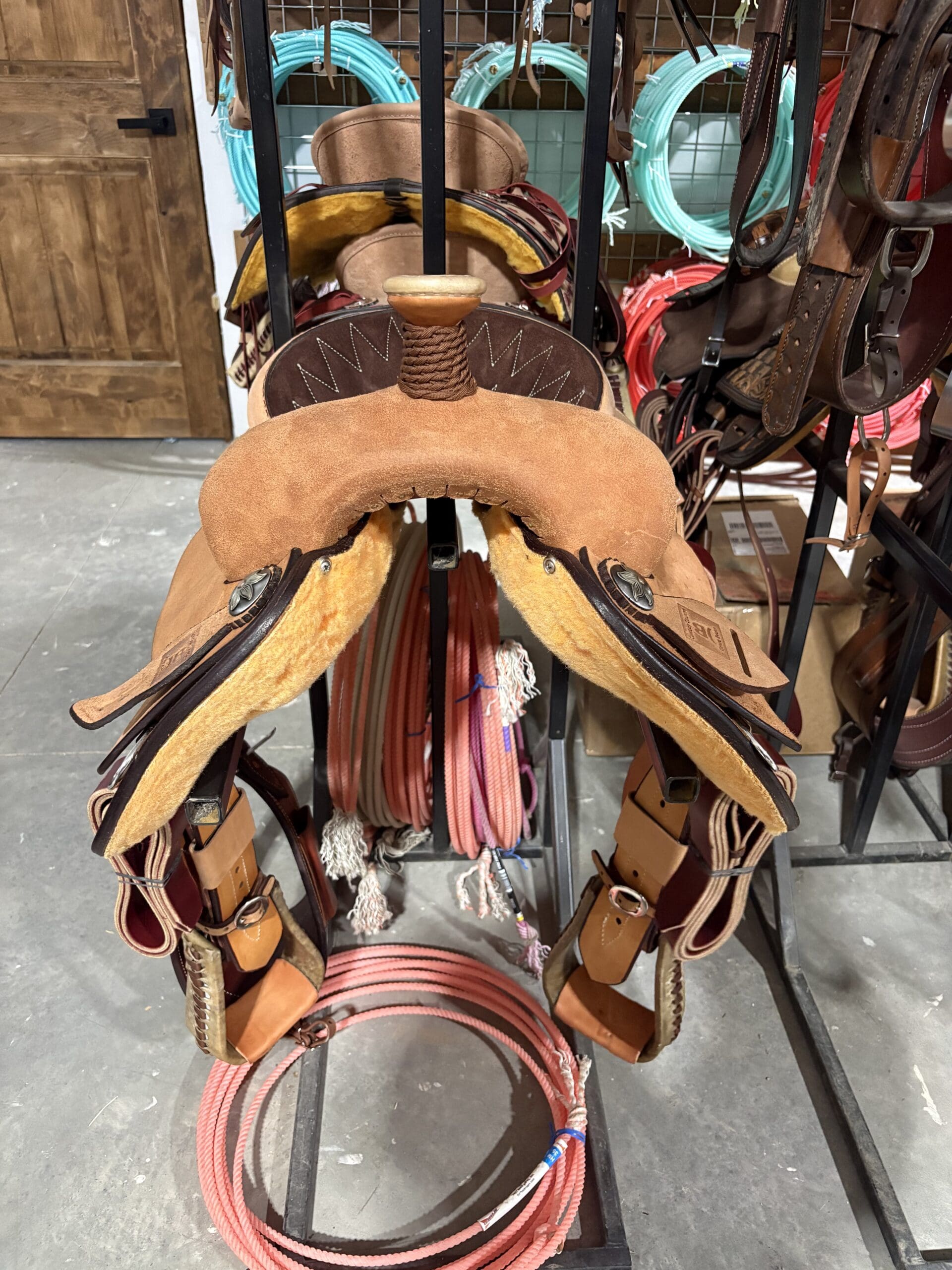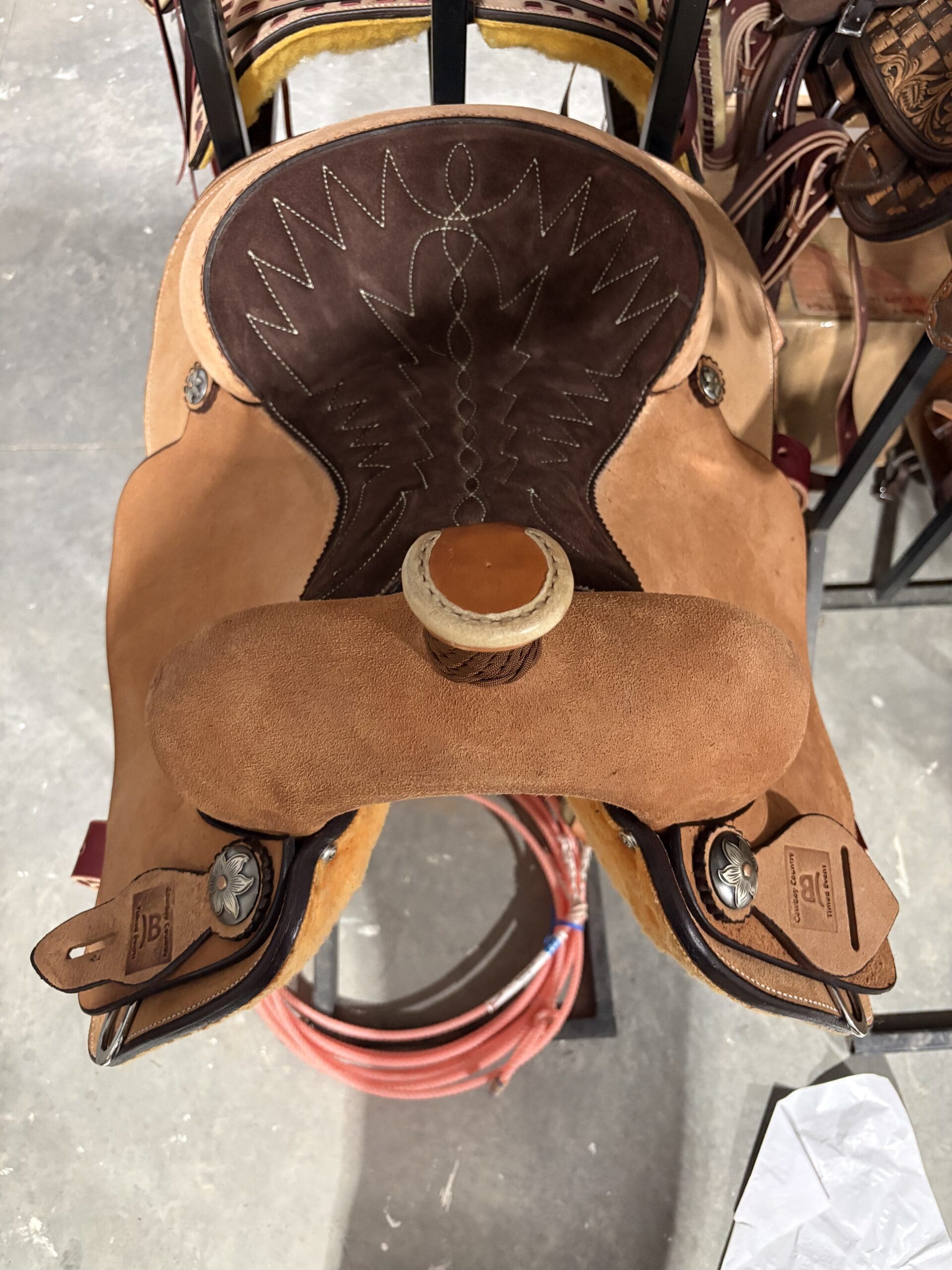 13.5″ BREAKAWAY ROPER W/ TR HORN. ROUGHOUT LEATHER CANTLE, DEE SKIRTS, 3″ ROPER STIRRUPS, MED OIL. NYLON BRAIDED HORN UPGRADEDCONCHOS CN23. QUILTED SEAT TAN STITCH ON CHOCOLATE SUEDE – SHORTENED FENDERS 30″ INSEAM.