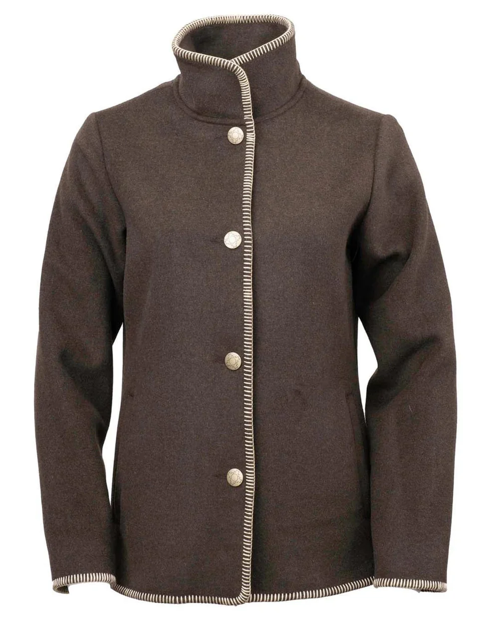The Margot Jacket is built for warmth with timeless western style. Featuring a soft polyester-wool blend, taffeta lining, and detailed whipstitch accents, it’s a versatile layer that dresses up or down with ease.