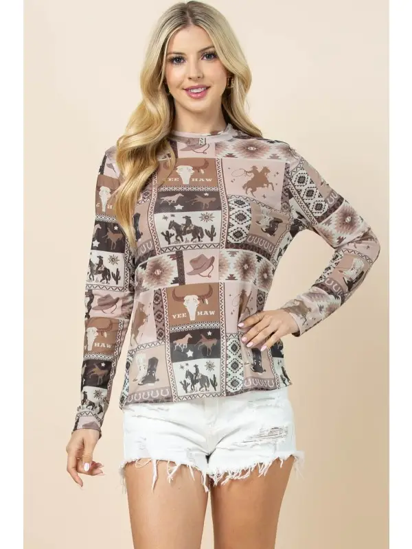 AMY WESTERN PRINT SEMI SHEER LONG SLEEVE MESH TOP