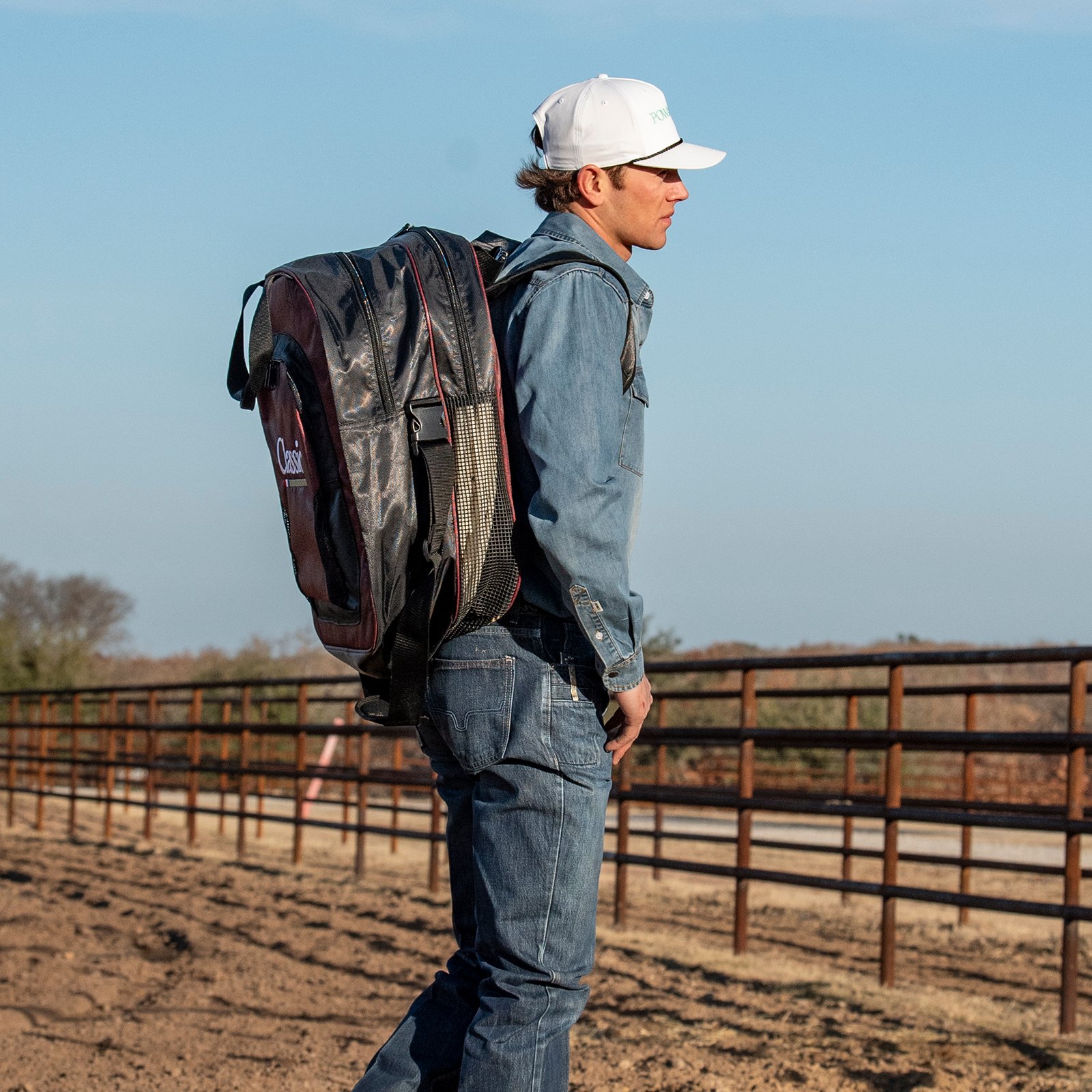 For those who need it all! Enclosed padded rope compartment has dividers to keep ropes separated and neat. Front pocket holds accessories and cell phones. Carry as a backpack, sling over your shoulder, or buckle to the fence. Holds up to nine ropes.